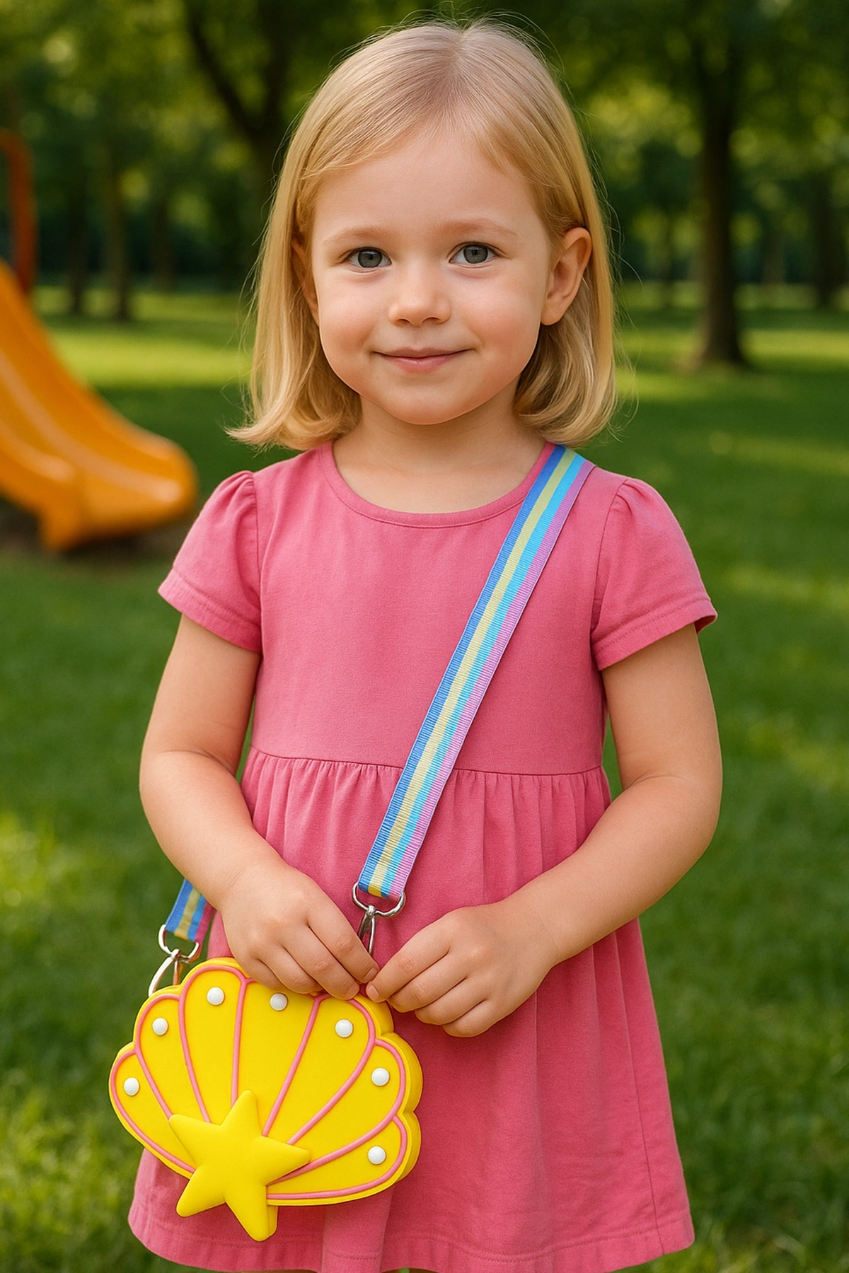 Yumuşak silikon malzemeden üretilen bu pembe deniz kabuğu çantası, hem şık hem de dayanıklı yapısıyla çocukların favorisi olacak.
