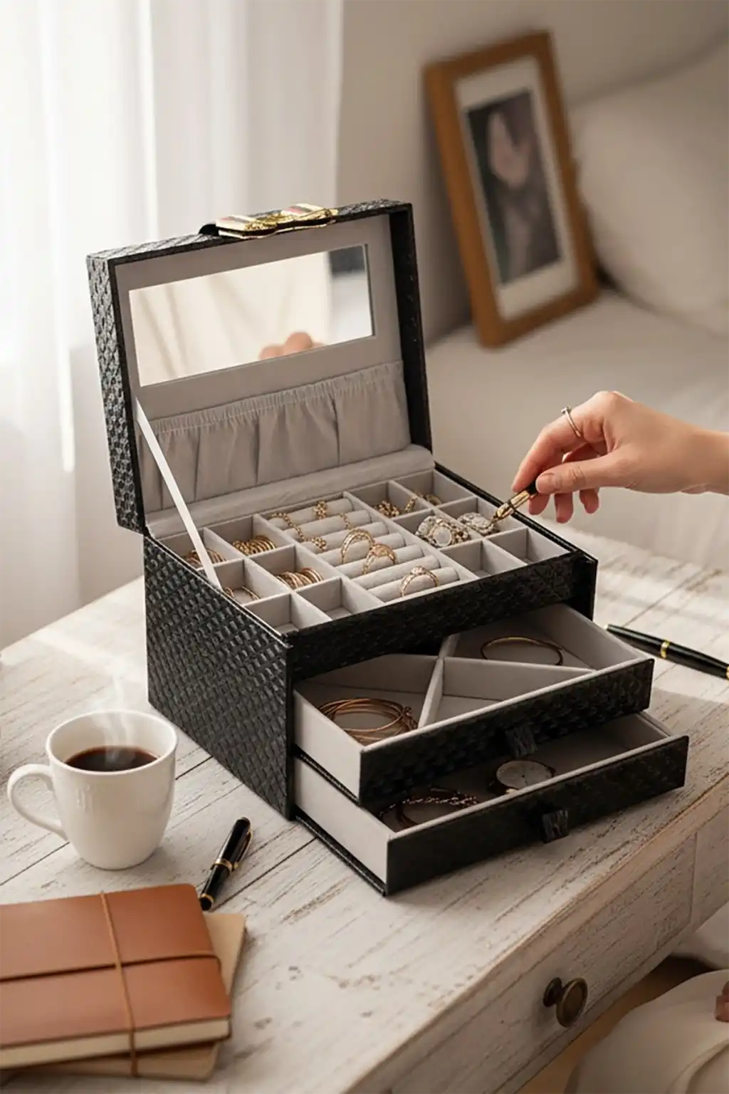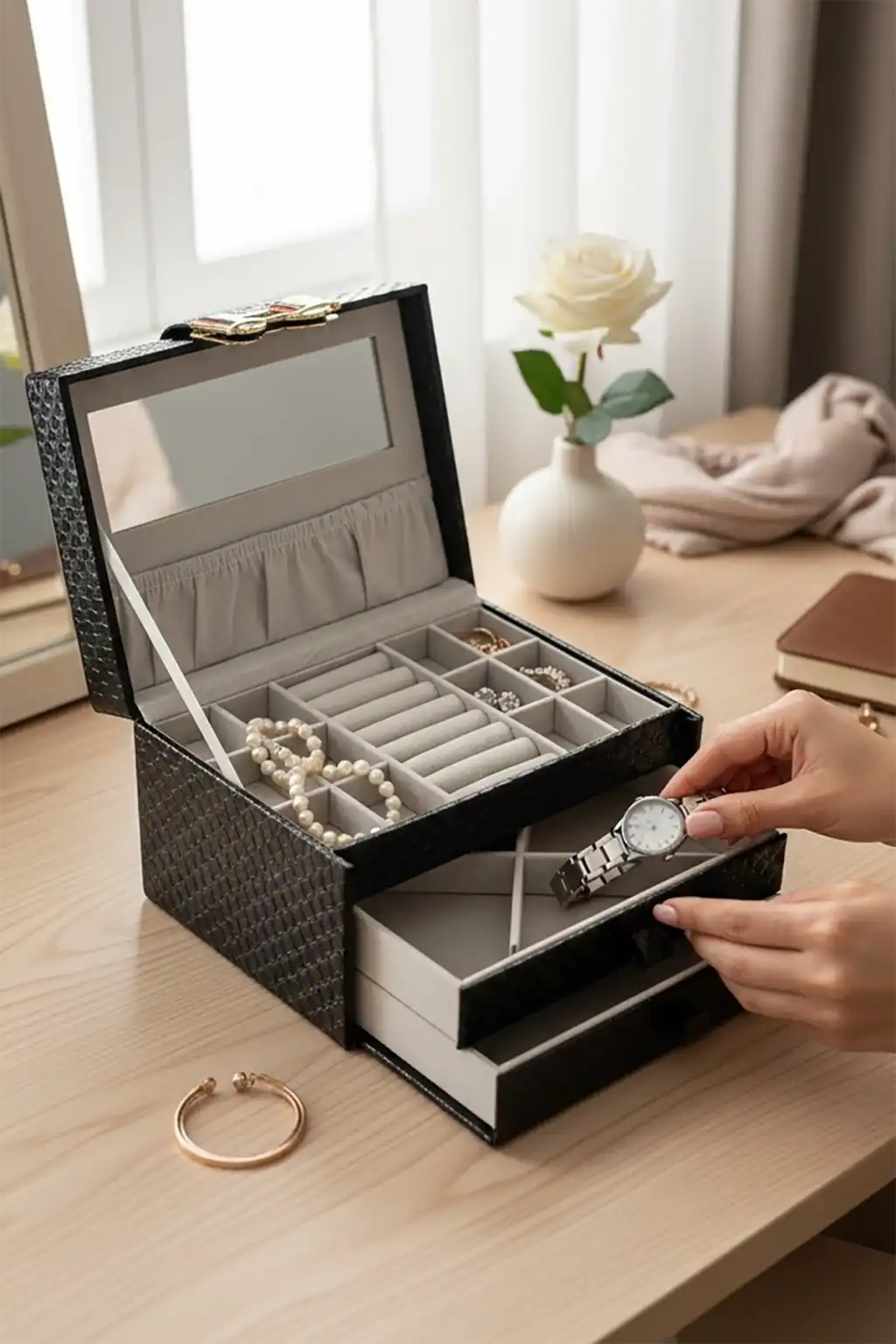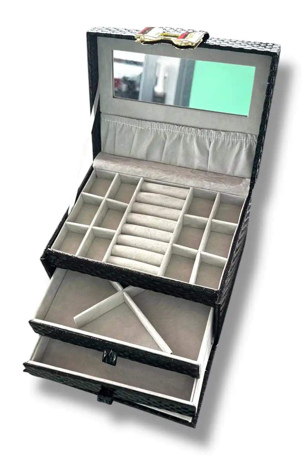 Siyah Renk Ayna Detaylı Çekmeceli Deri Takı Organizeri