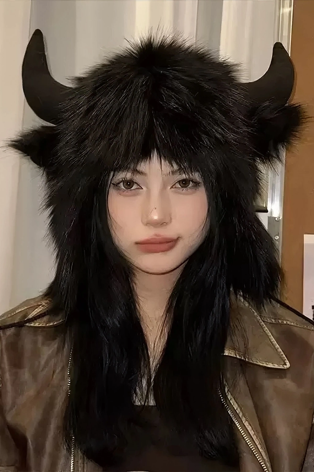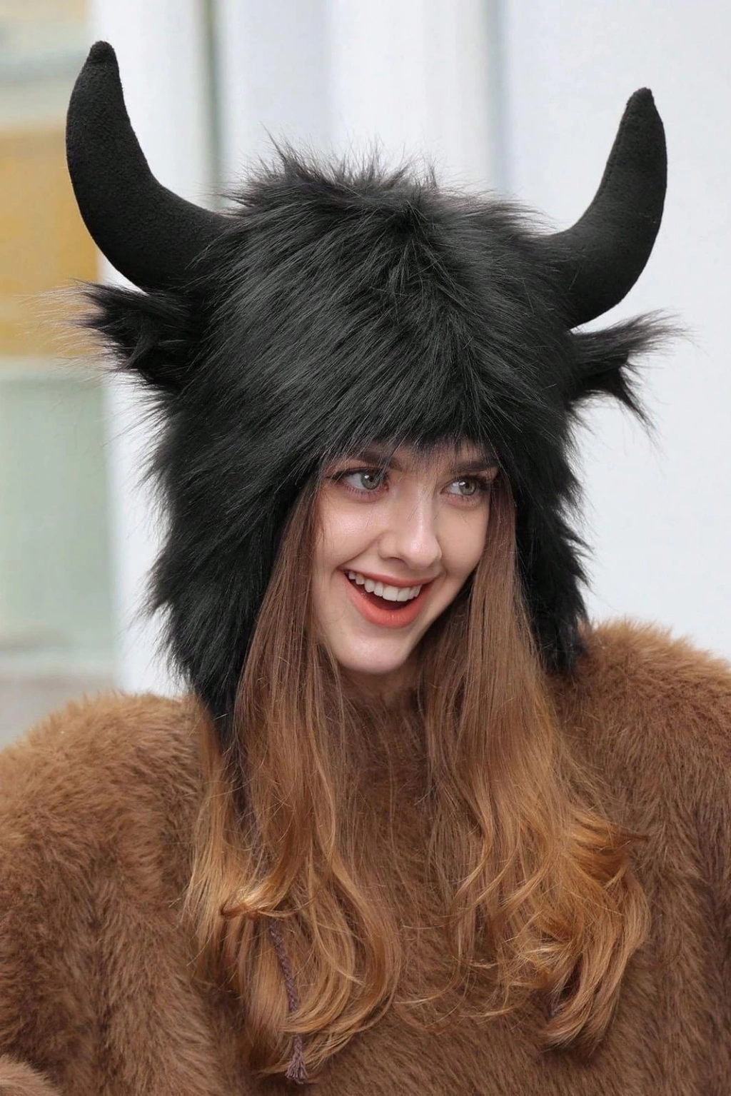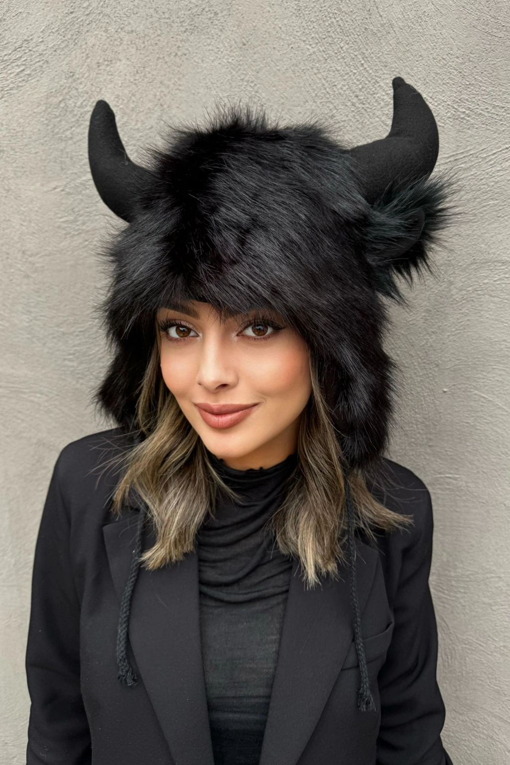 Siyah Renk Boynuz Detaylı Peluş Şapka