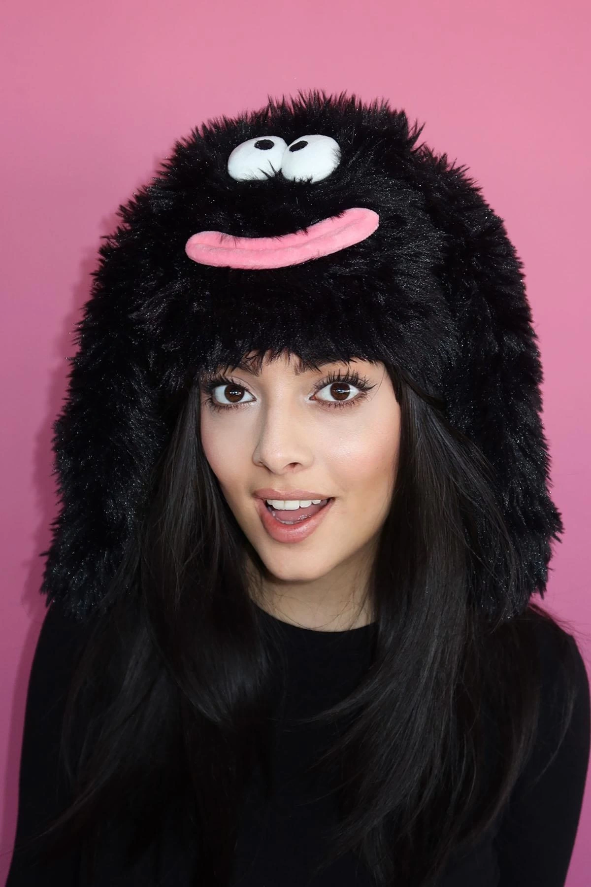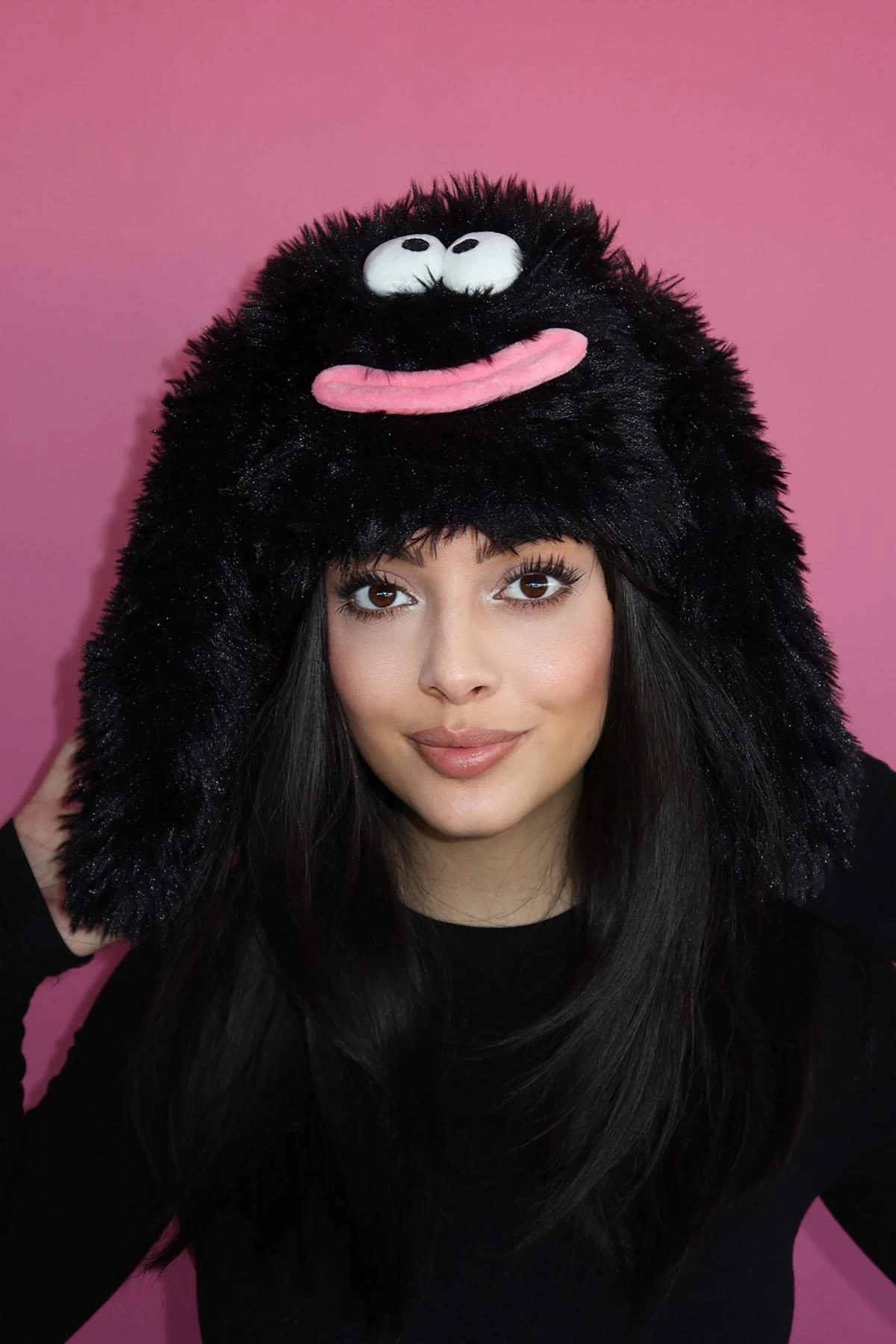 Siyah Renk Canavar Figürlü Kulaklı Peluş Şapka