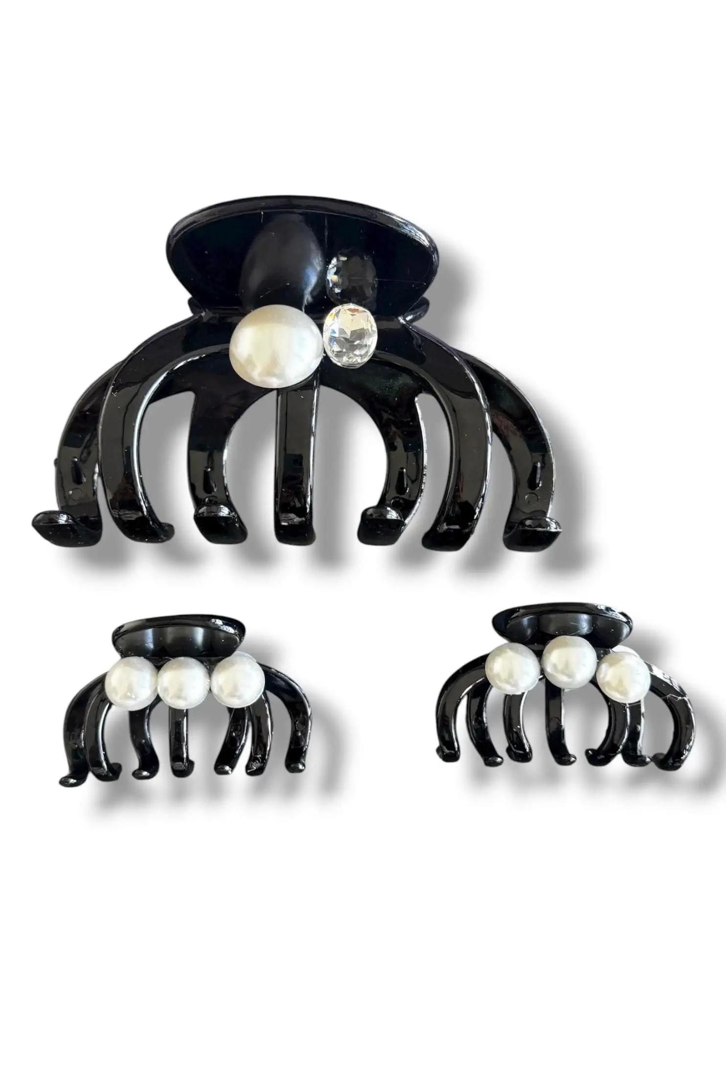 Siyah Renk İnci Detaylı 3'lü Kemik Mandal Toka Set