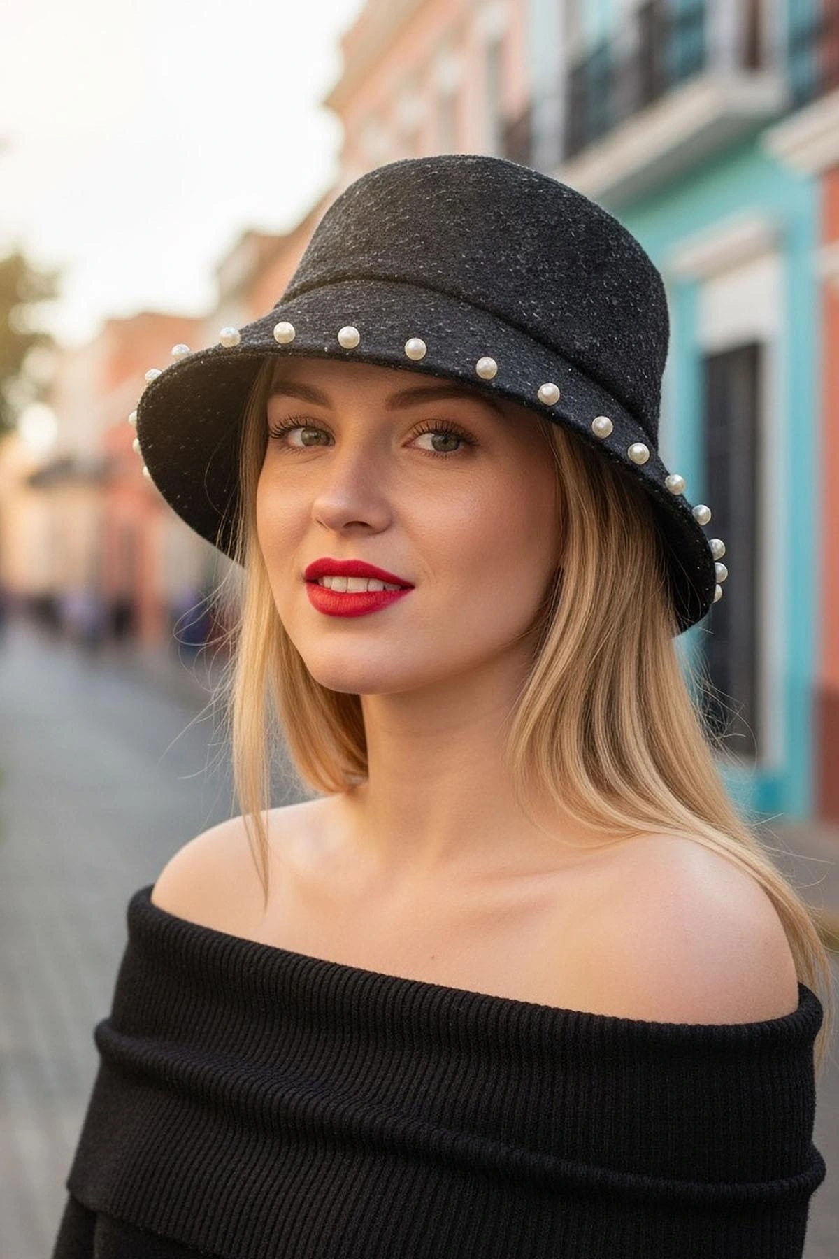 Siyah Renk İnci Detaylı Kot Tasarım Şapka