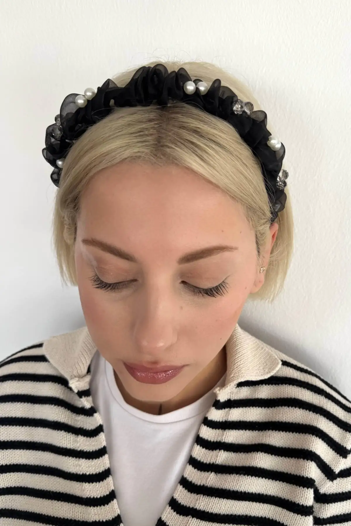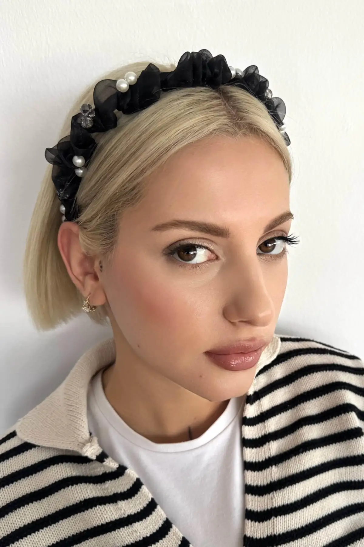 Siyah Renk İnci Ve Taş Detaylı Taç