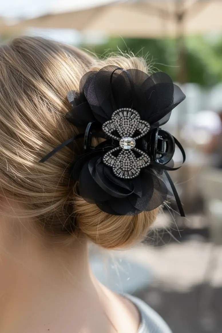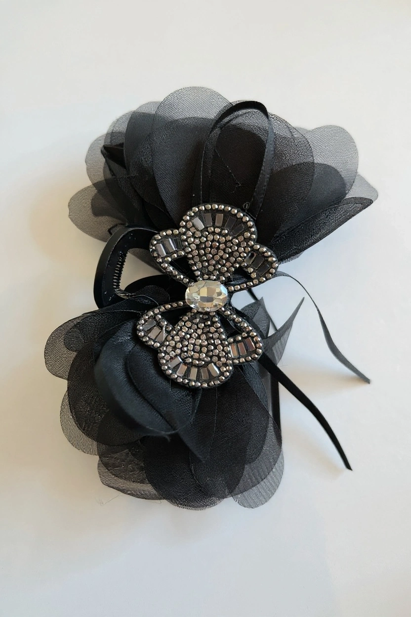 Siyah Renk Taş Detaylı Kurdele Figürlü Mandal Toka