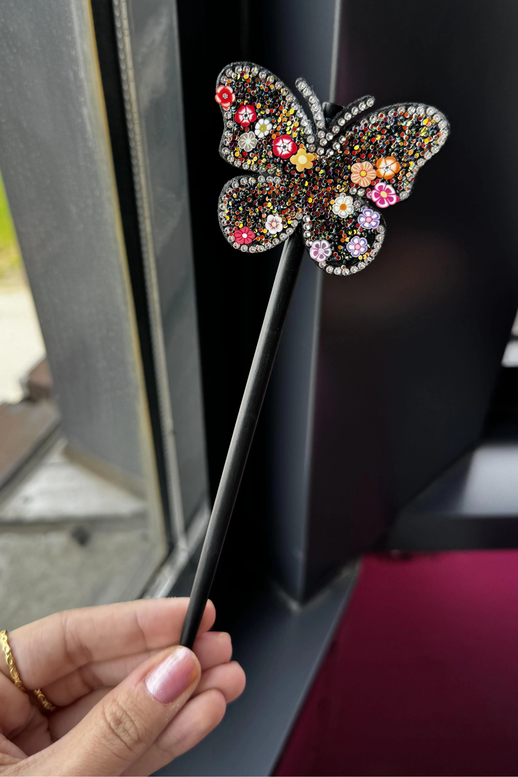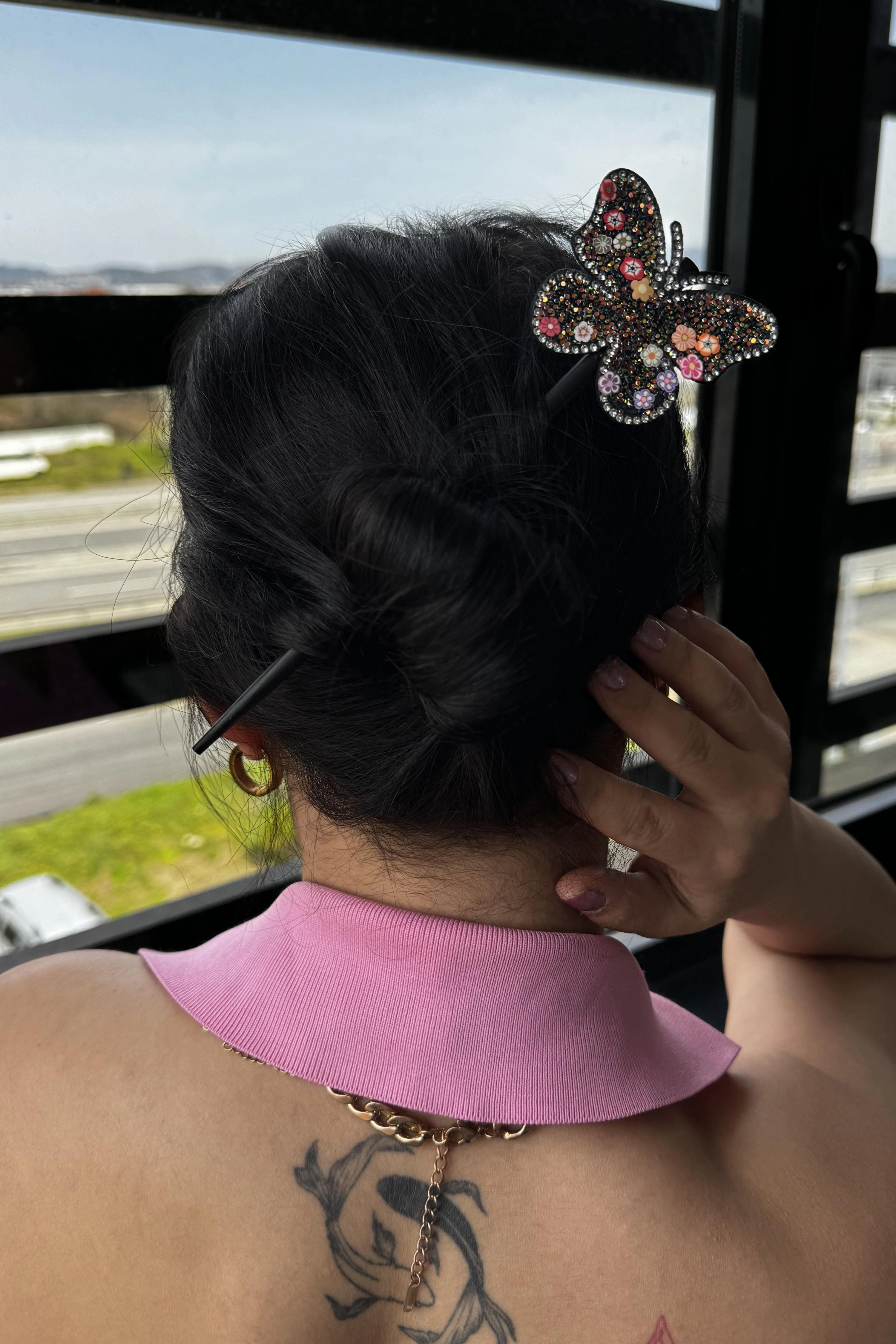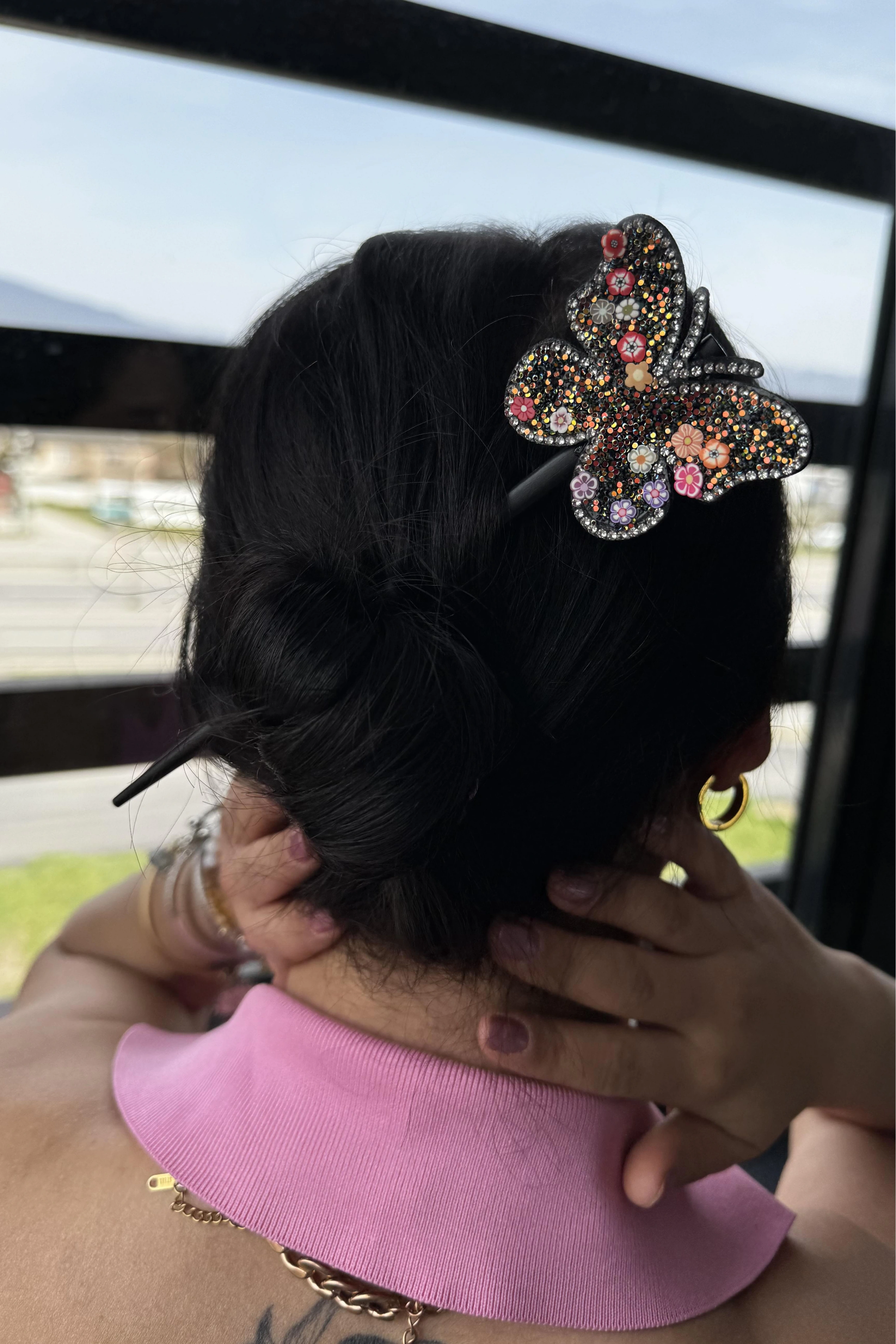 Siyah Renk Kelebek Figürlü Topuz Tokası/Topuz Kalemi