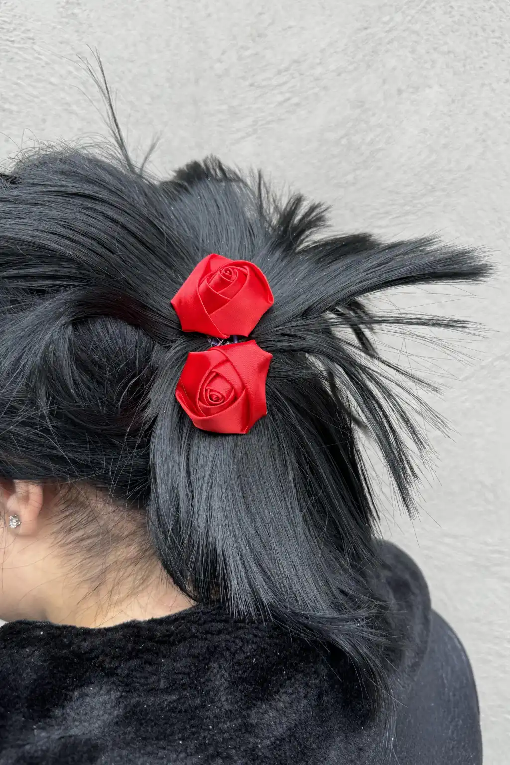 Siyah Renk Kırmızı Gül Detaylı Dağınık Topuz Efektli Mandal Toka