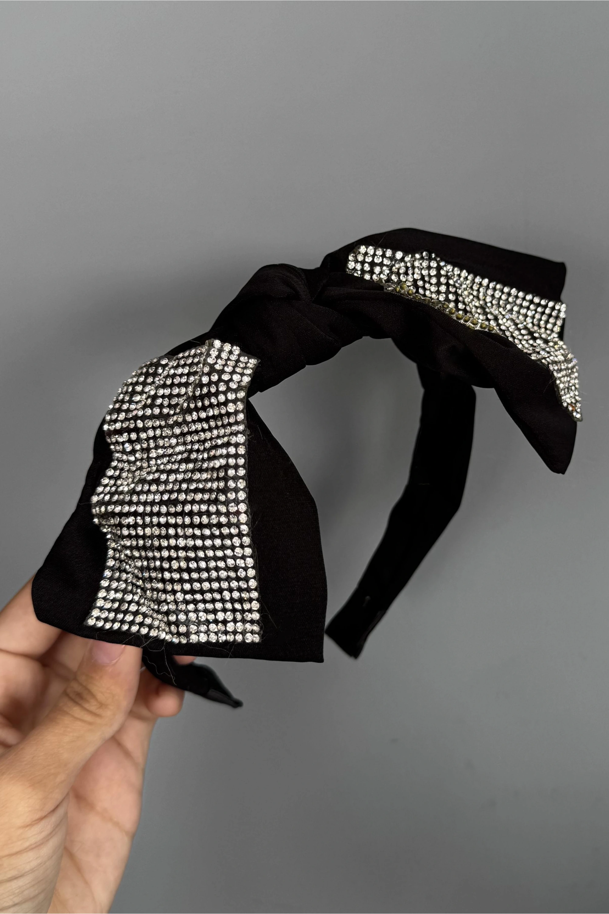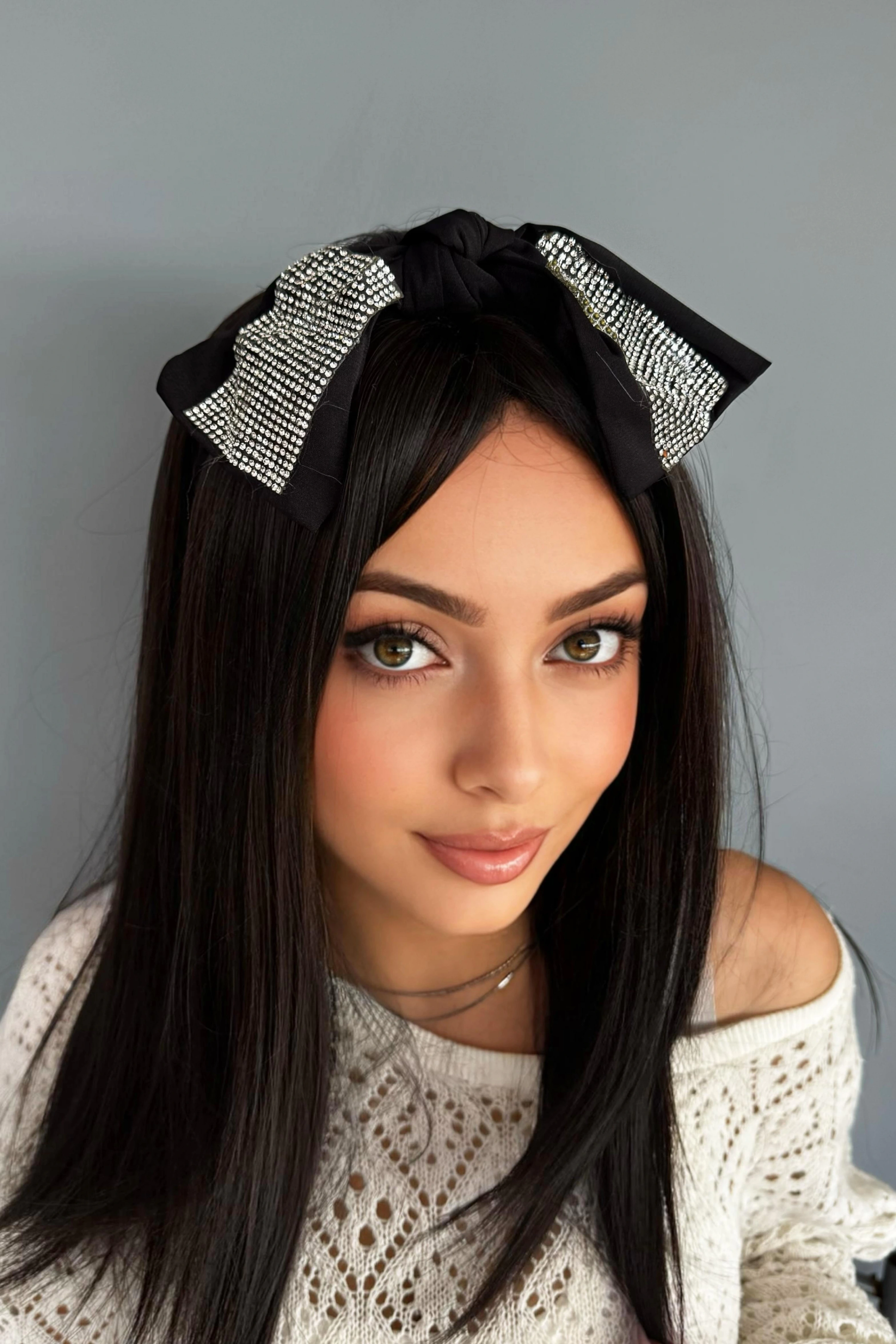 Siyah Renk Kurdele Figürlü Taş Detaylı Saten Taç