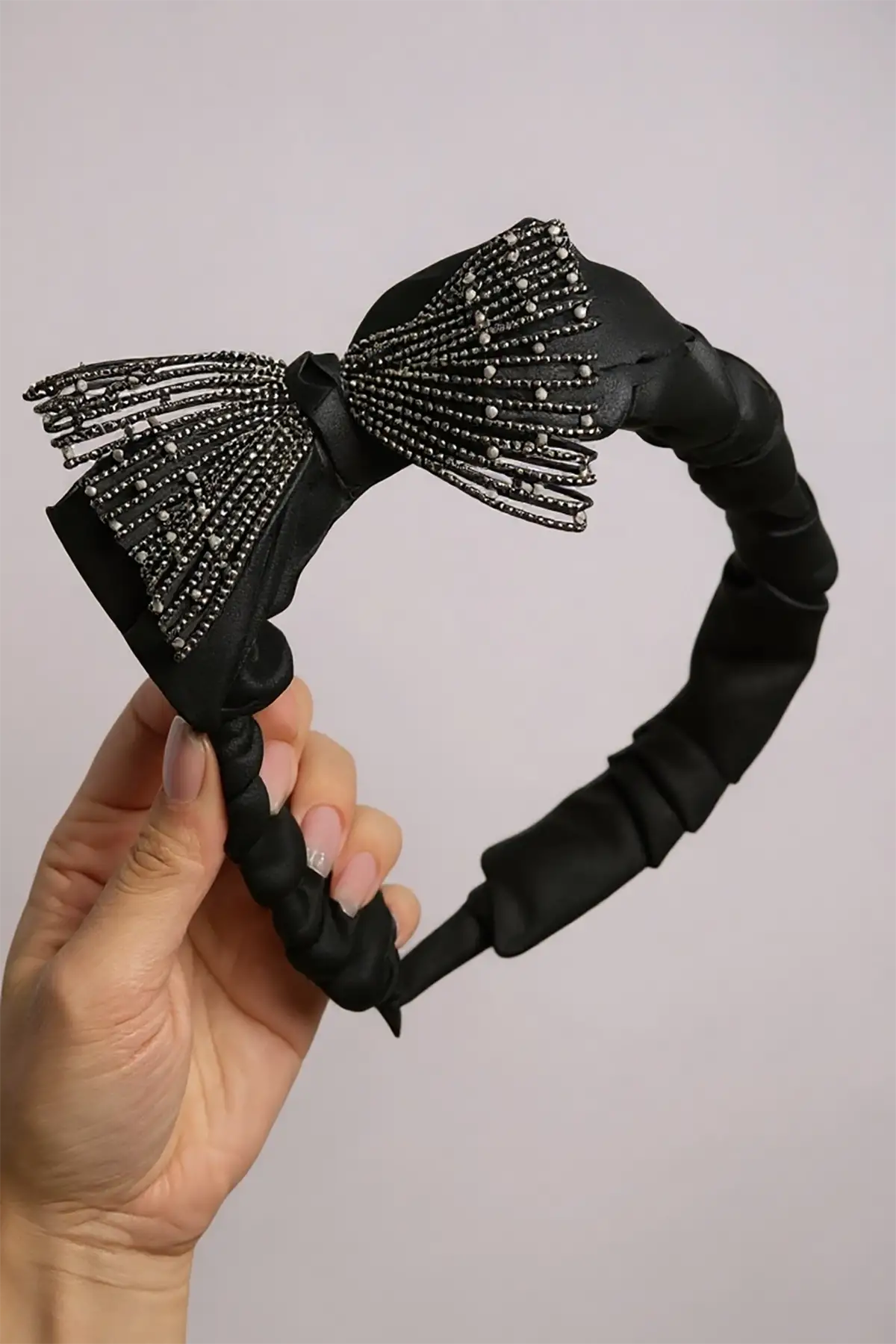 Siyah Renk Taş Detaylı Büzgülü Taç