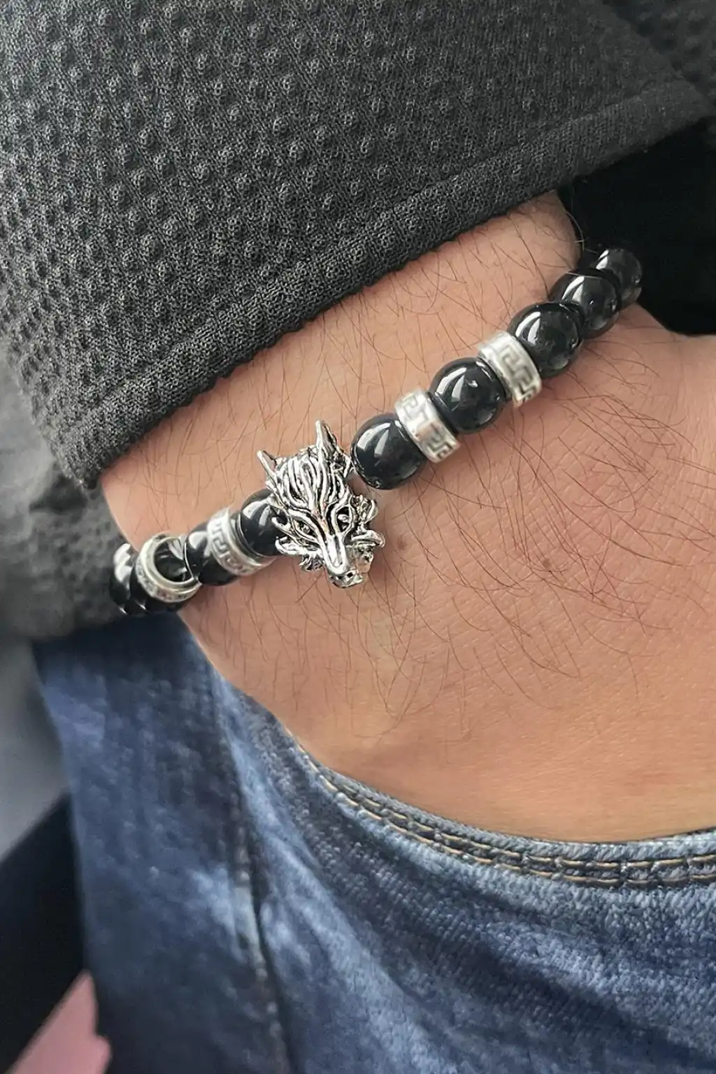 Siyah Renk Kurt Figürlü Erkek Boncuk Bileklik
