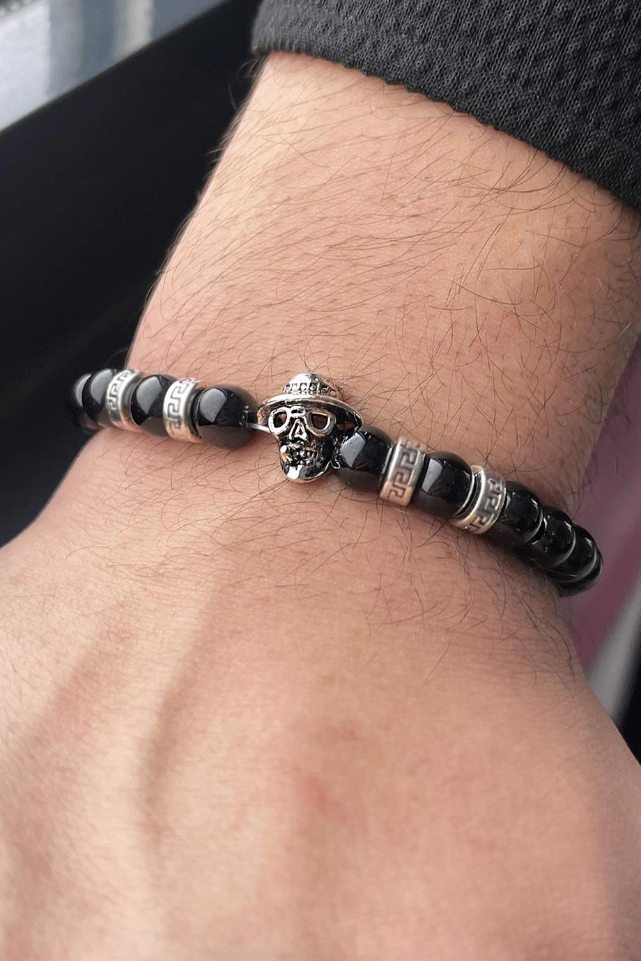 Siyah Renk Kurukafa Figürlü Erkek Boncuk Bileklik