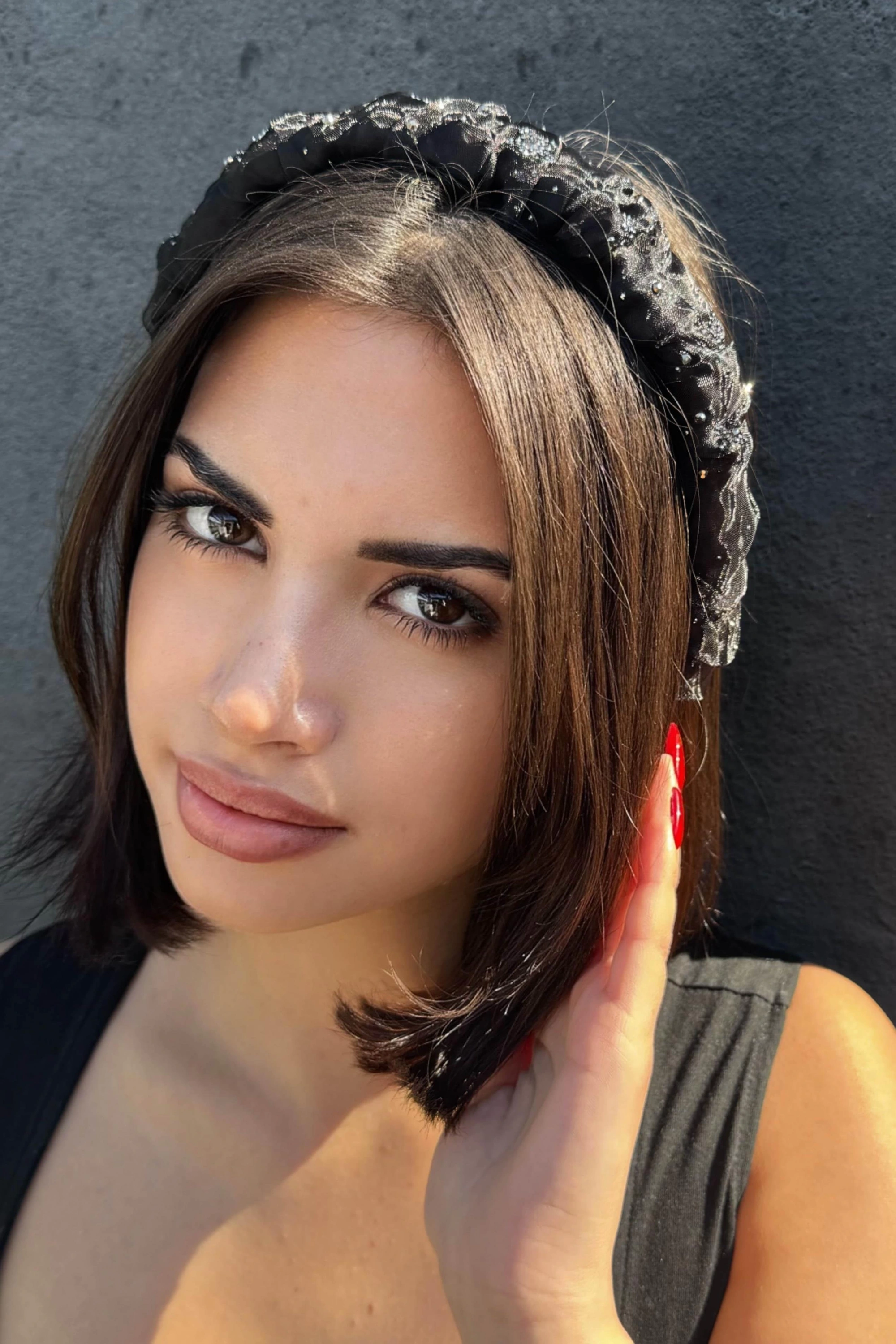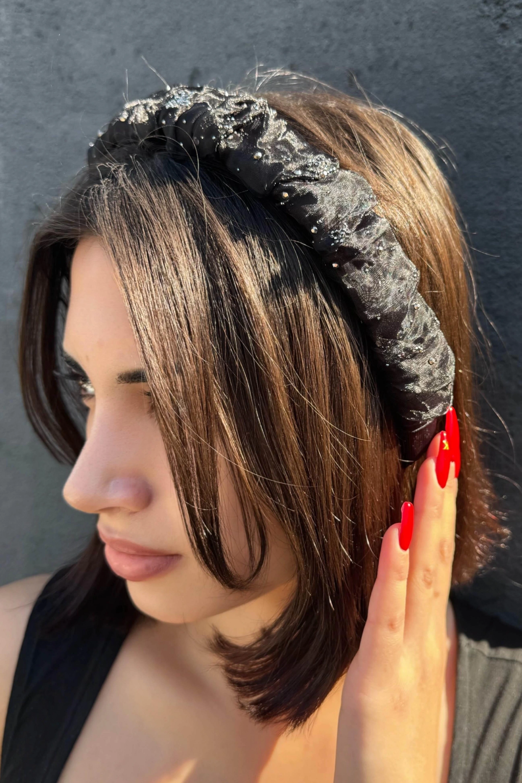 Siyah Renk Taş Detaylı Büzgülü Taç