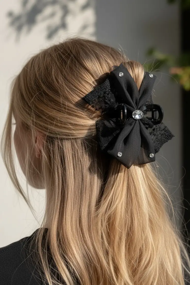 Siyah Renk Taş Detaylı Kurdele Figürlü Puantiyeli Mandal Toka