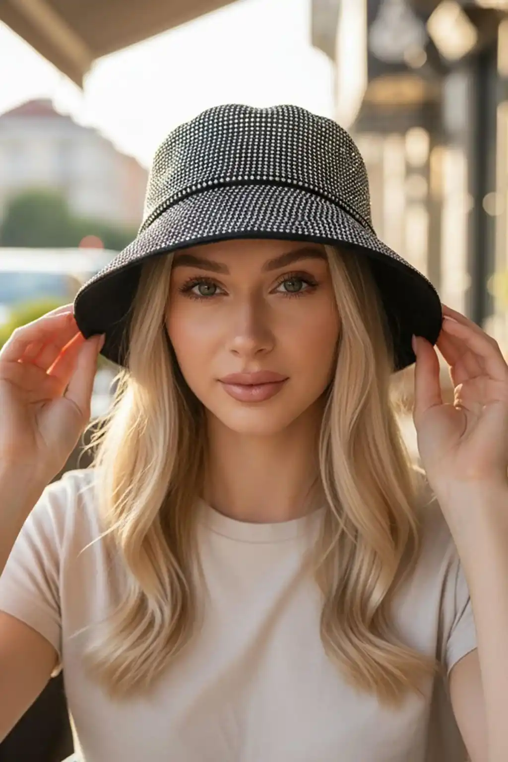 Beyaz Renk Taşlı Bucket Şapka