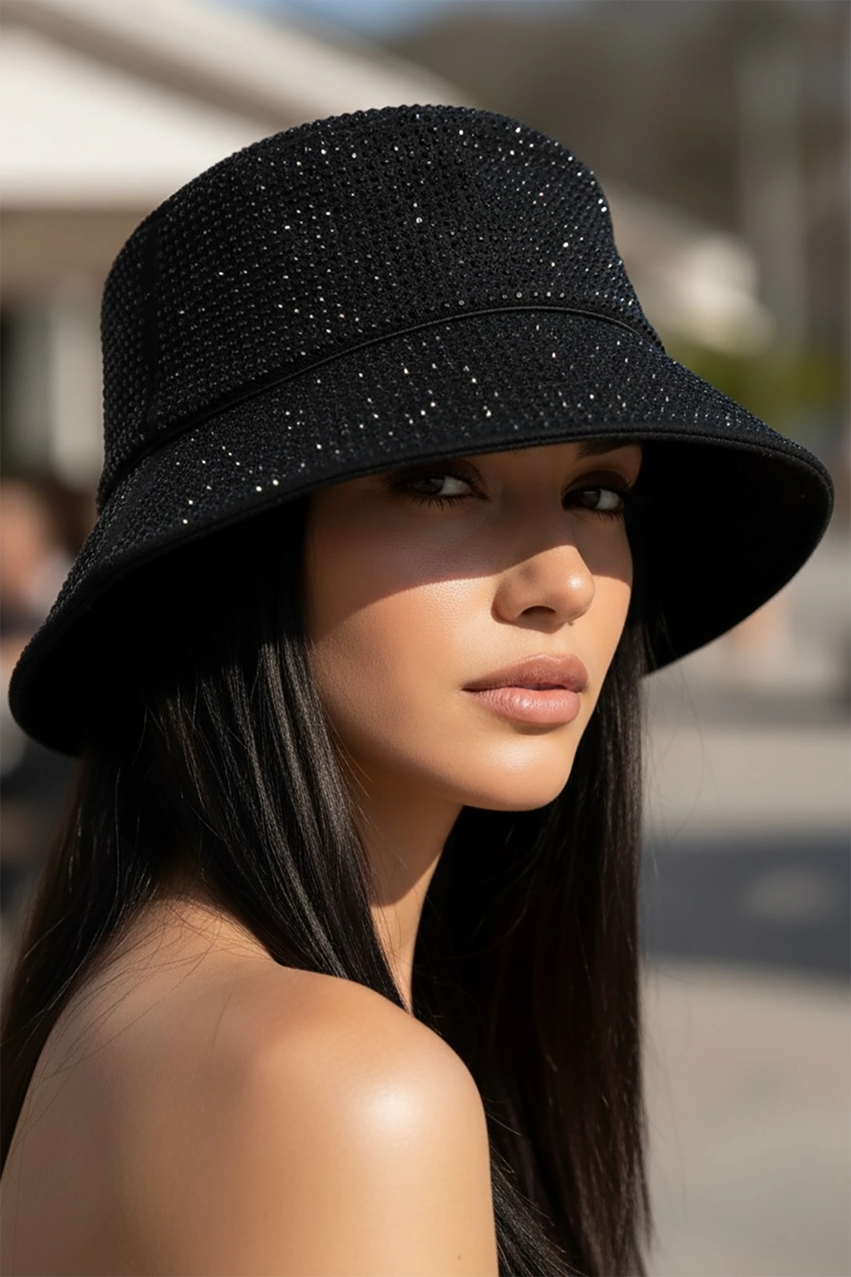 Siyah Renk Taşlı Bucket Şapka