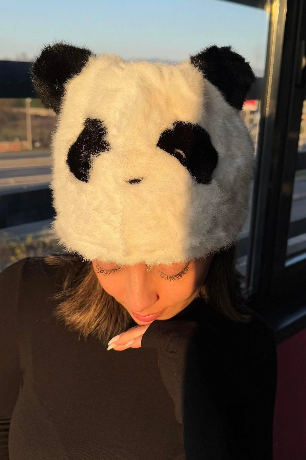Siyah Ve Beyaz Renk Panda Figürlü Peluş Şapka