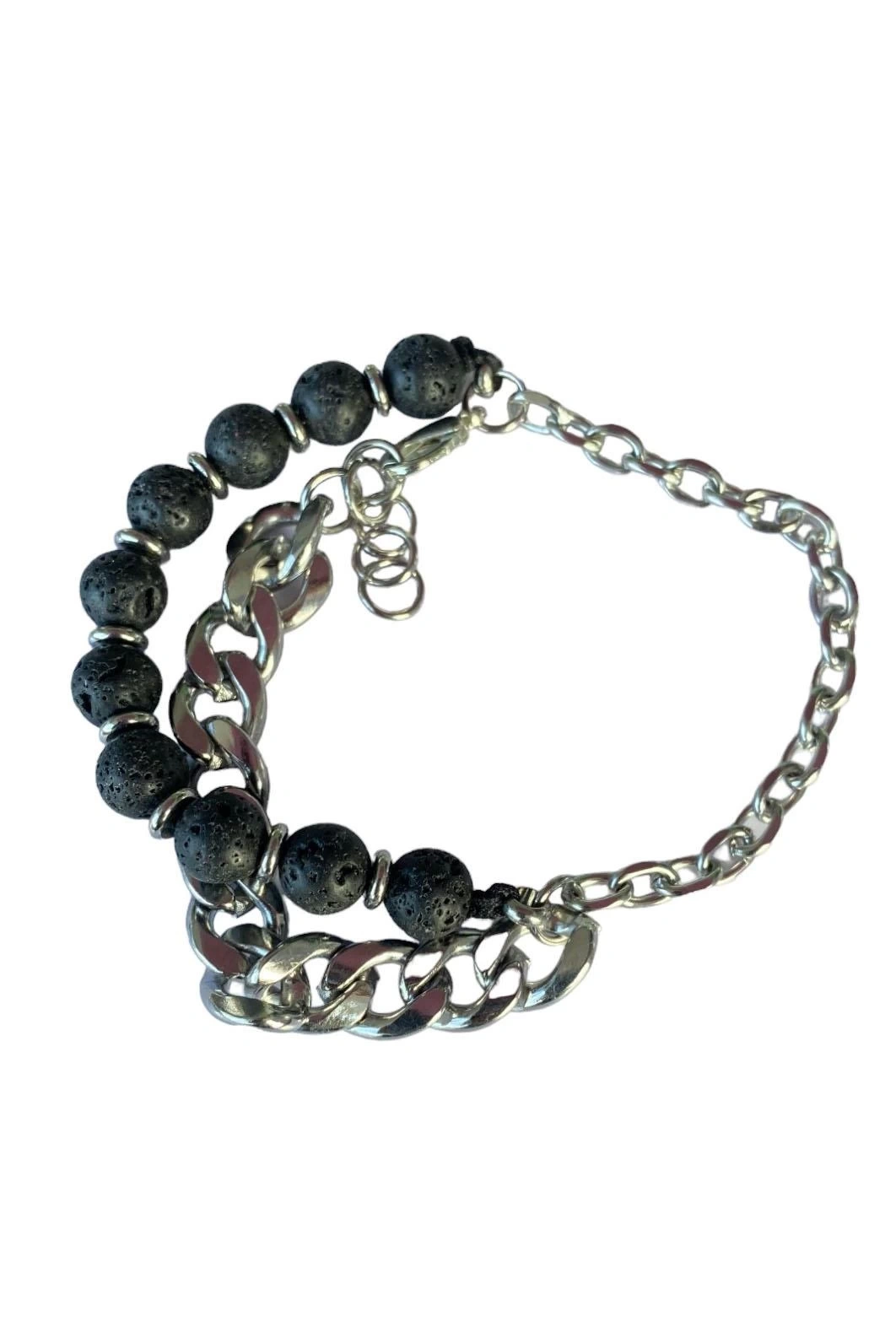 Siyah Ve Gümüş Renk Boncuk Figürlü Zincir Detaylı Erkek Bileklik