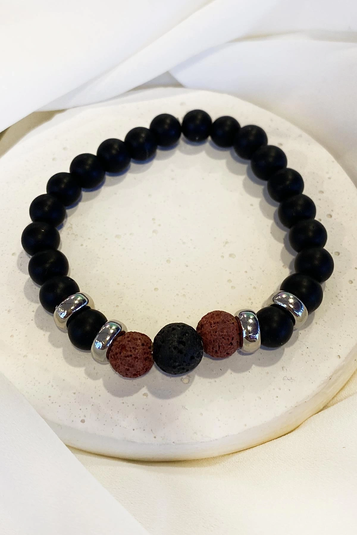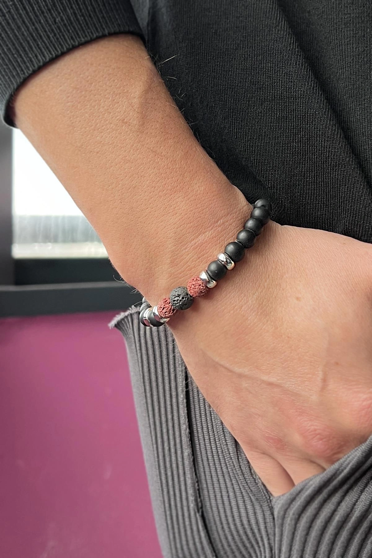 Siyah Ve Kırmızı Renk Boncuk Detaylı Erkek Bileklik