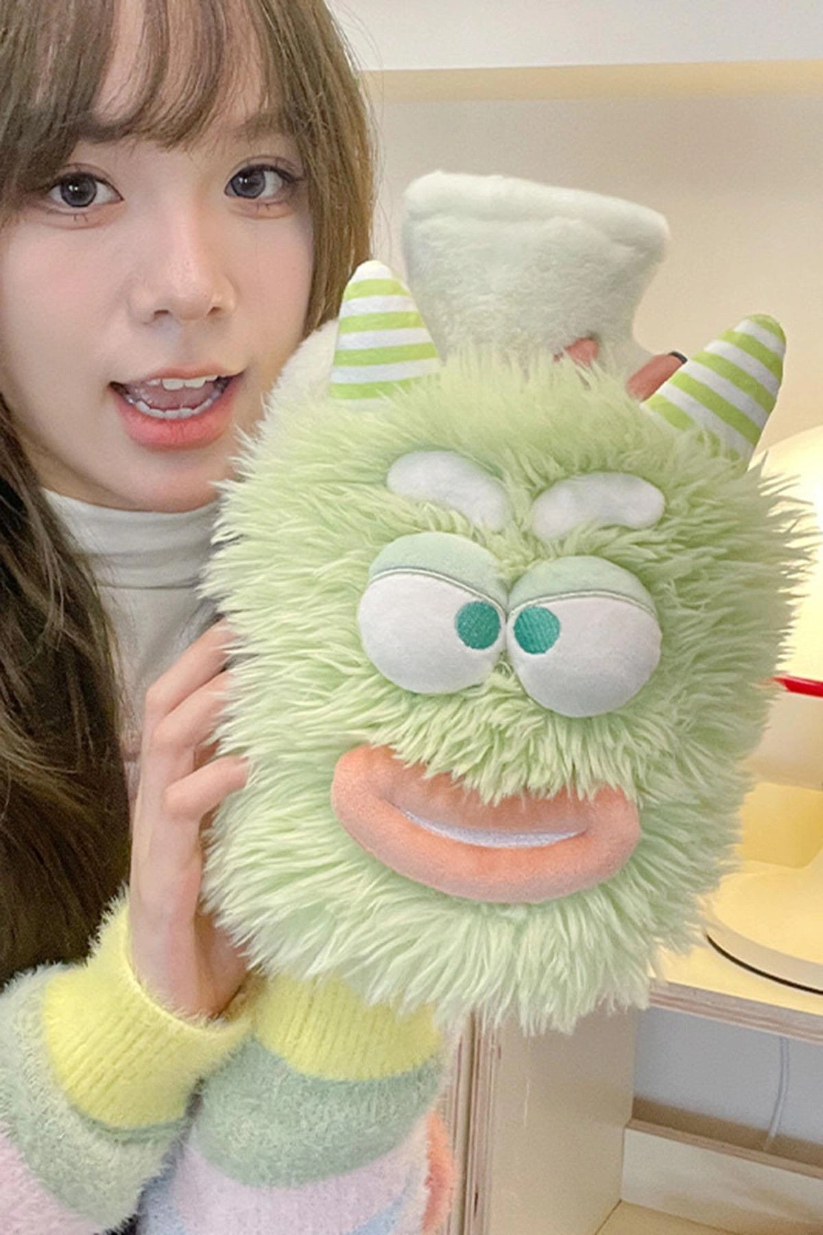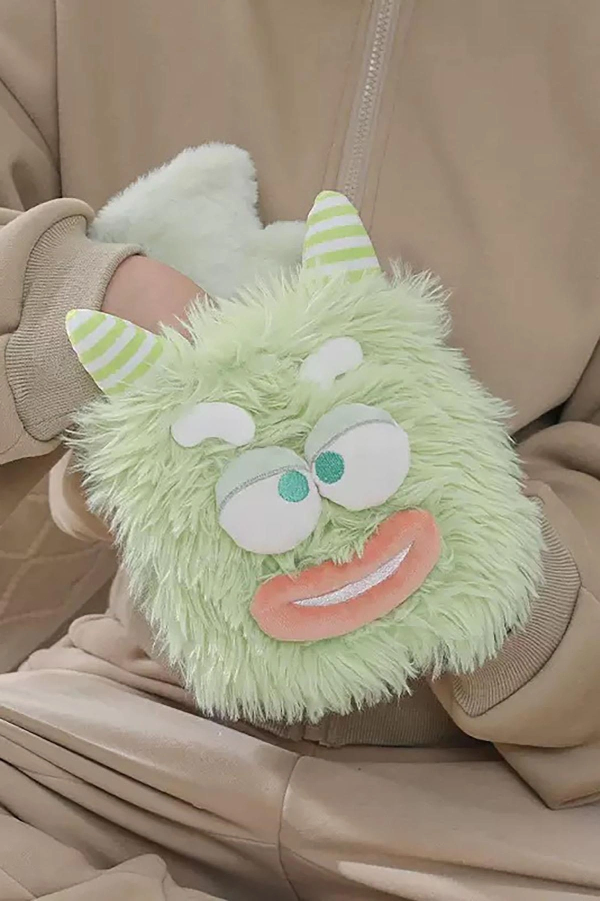 Sevimli canavar figürüyle tasarlanan bu peluş sıcak su torbası, soğuk günlerde hem içinizi ısıtır hem de tatlı görünümüyle yüzünüzü gülümsetir. Yumuşacık peluş dış yüzeyi sayesinde cilde dosttur, sarıldıkça rahatlatıcı bir his verir.