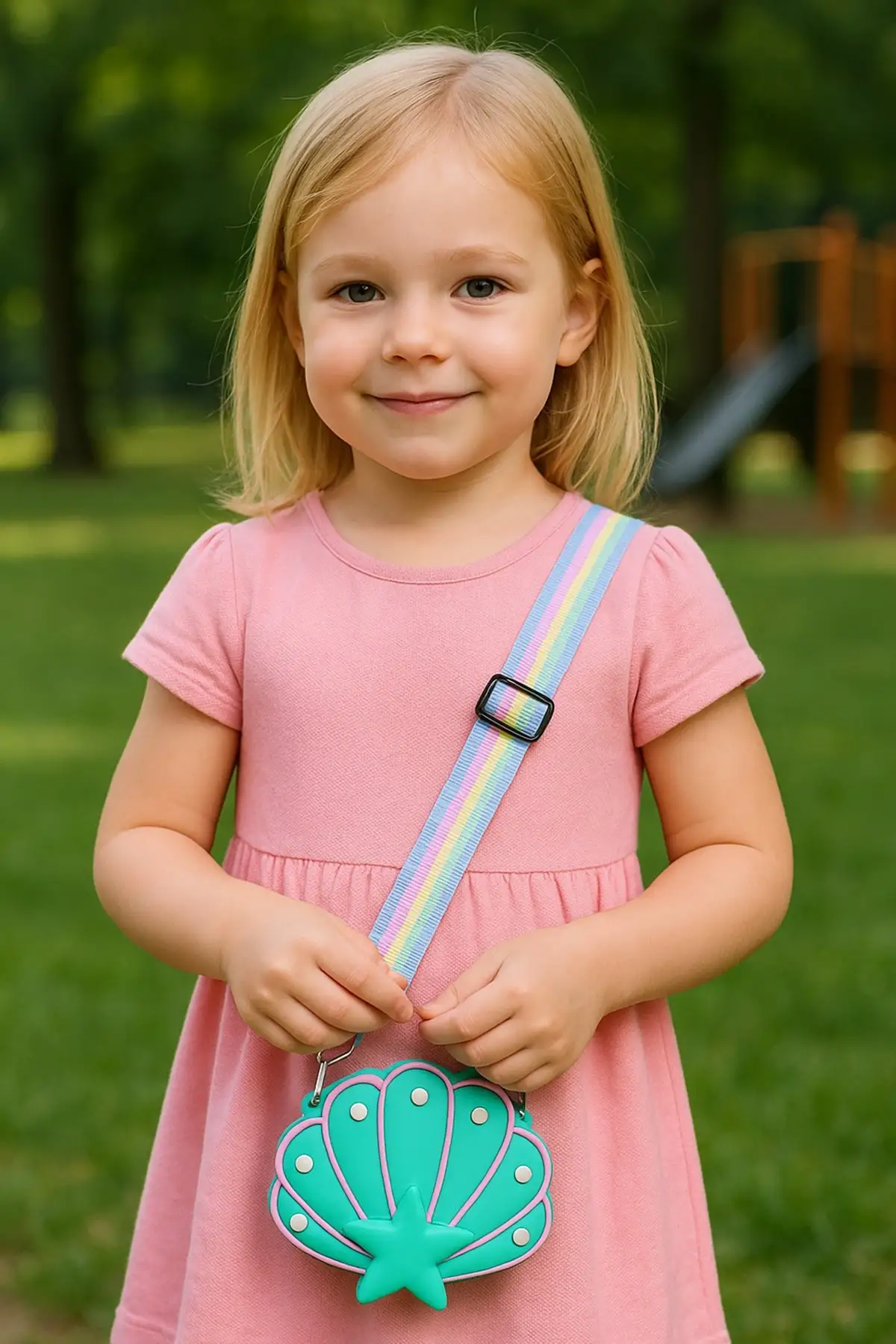 Yumuşak silikon malzemeden üretilen bu pembe deniz kabuğu çantası, hem şık hem de dayanıklı yapısıyla çocukların favorisi olacak.