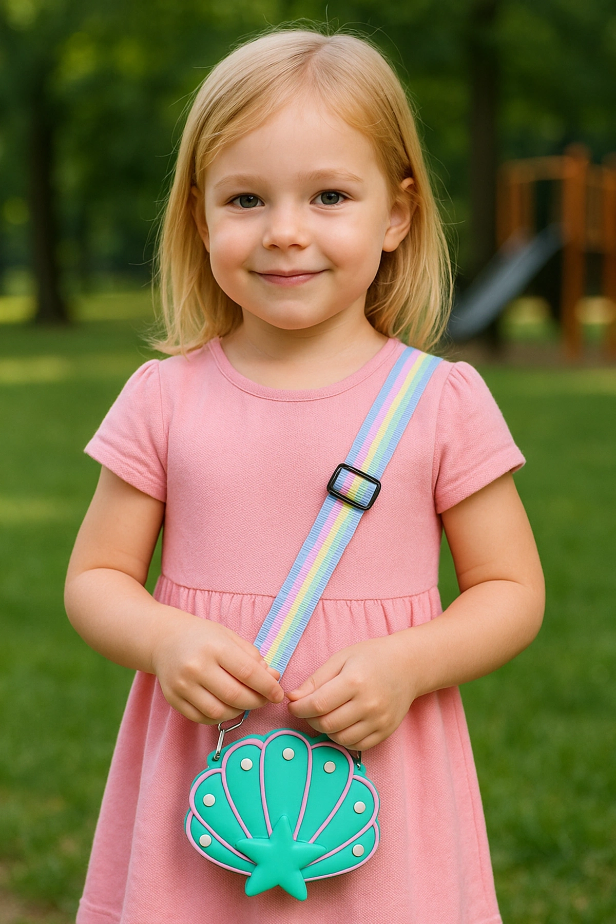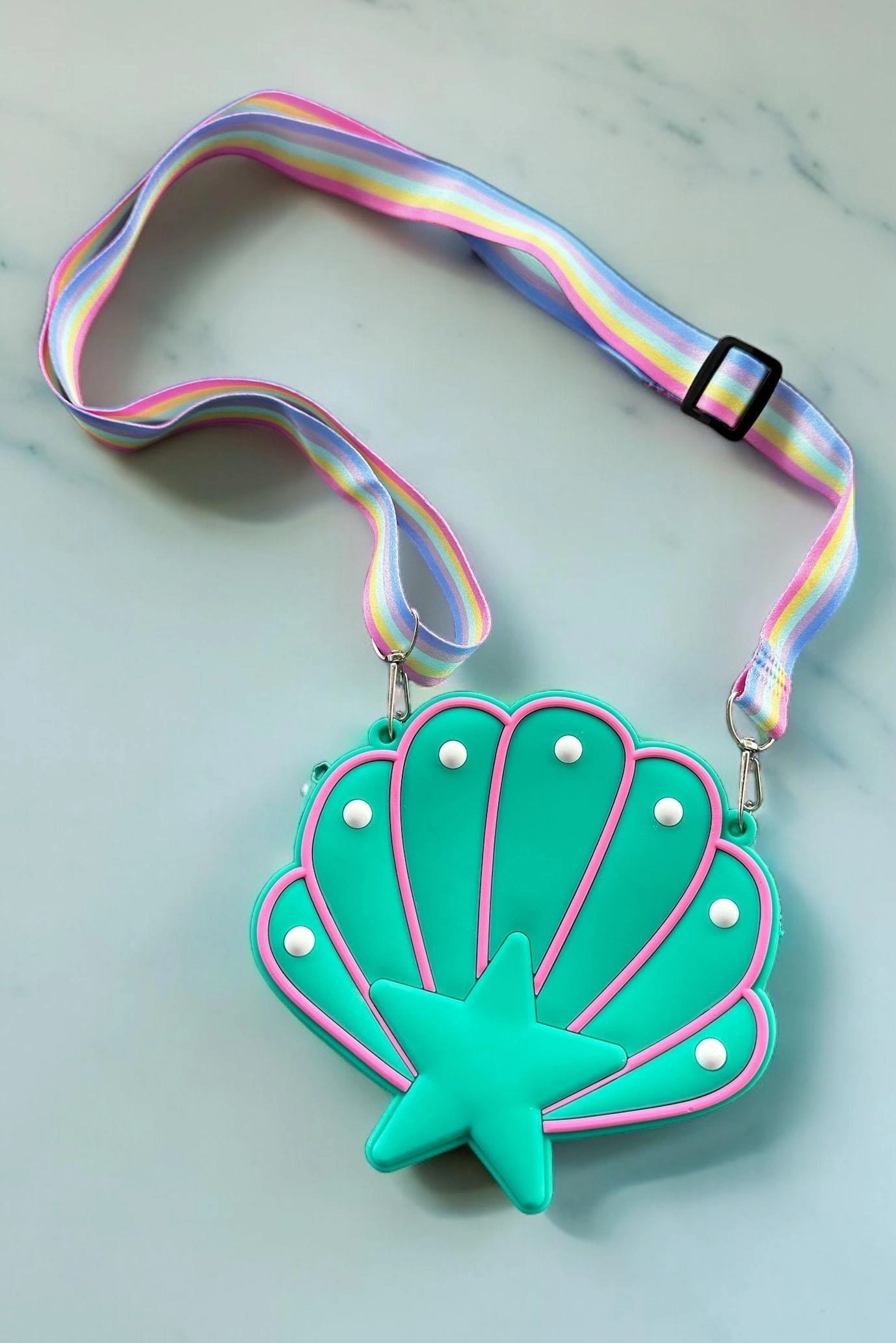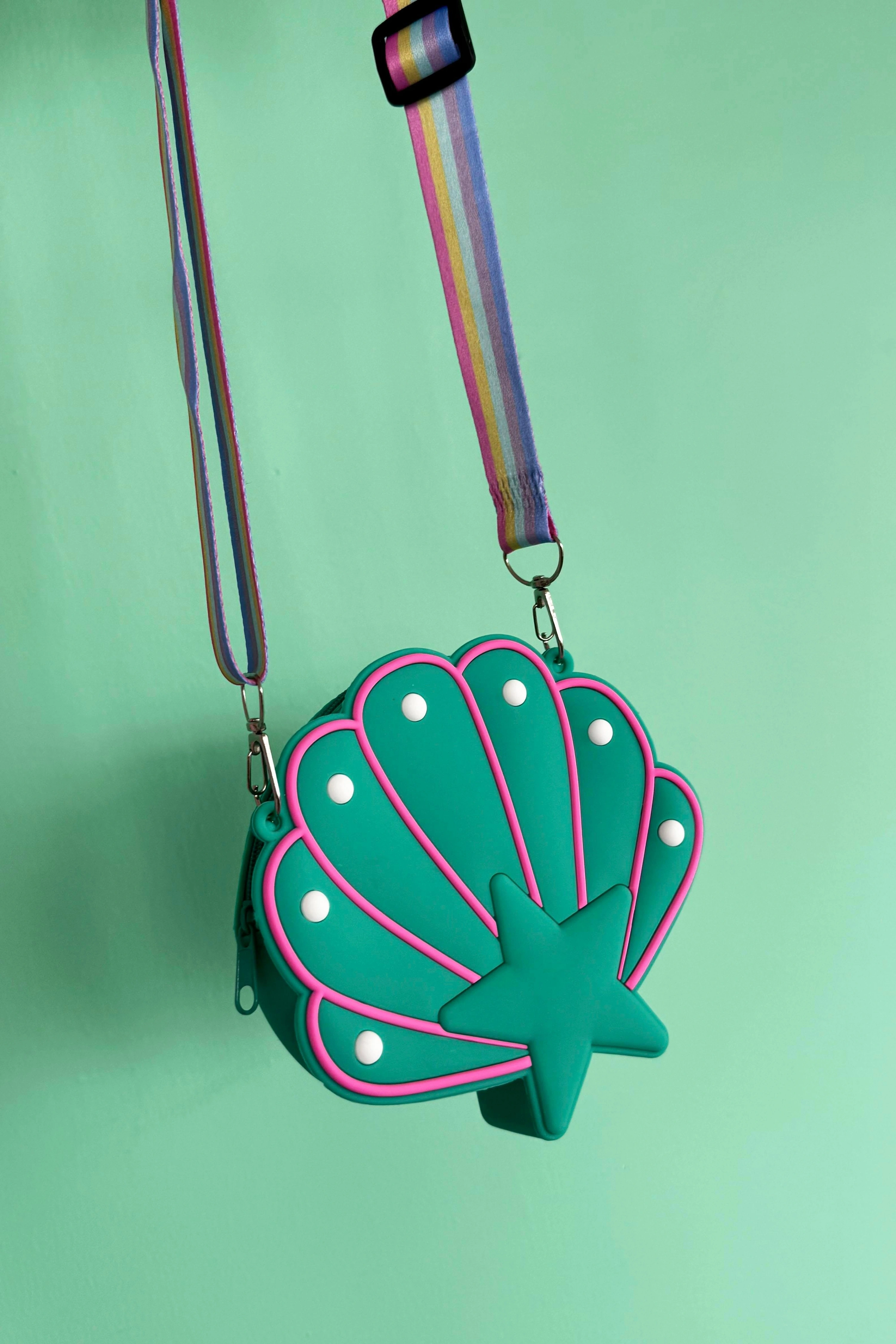 Yumuşak silikon malzemeden üretilen bu pembe deniz kabuğu çantası, hem şık hem de dayanıklı yapısıyla çocukların favorisi olacak.
