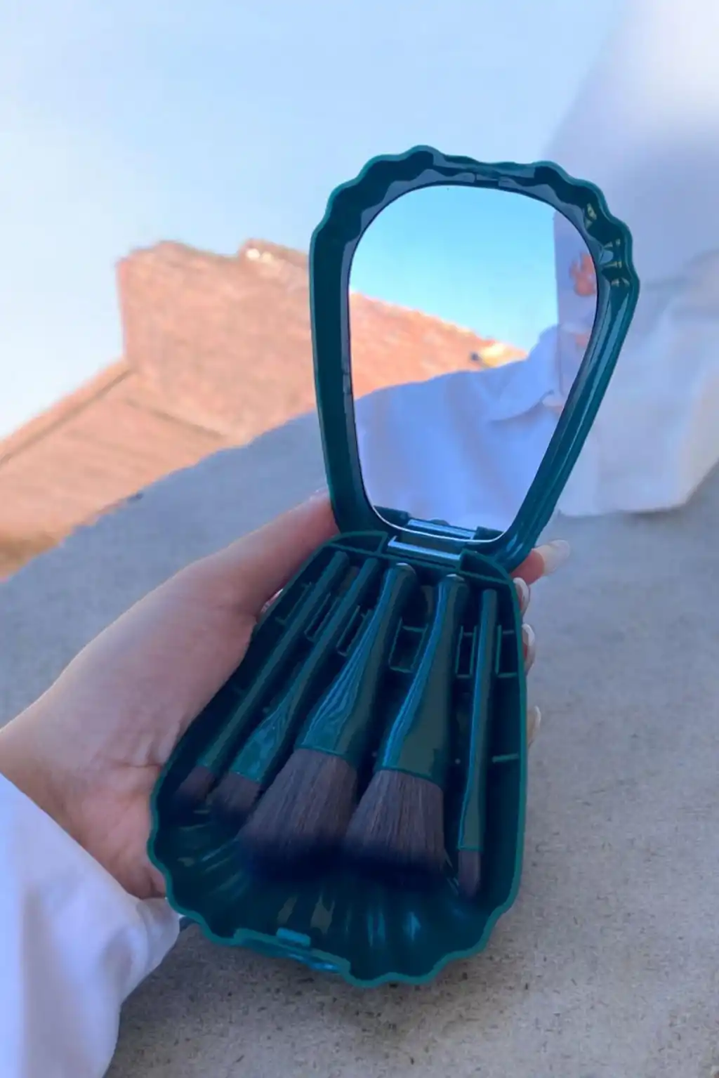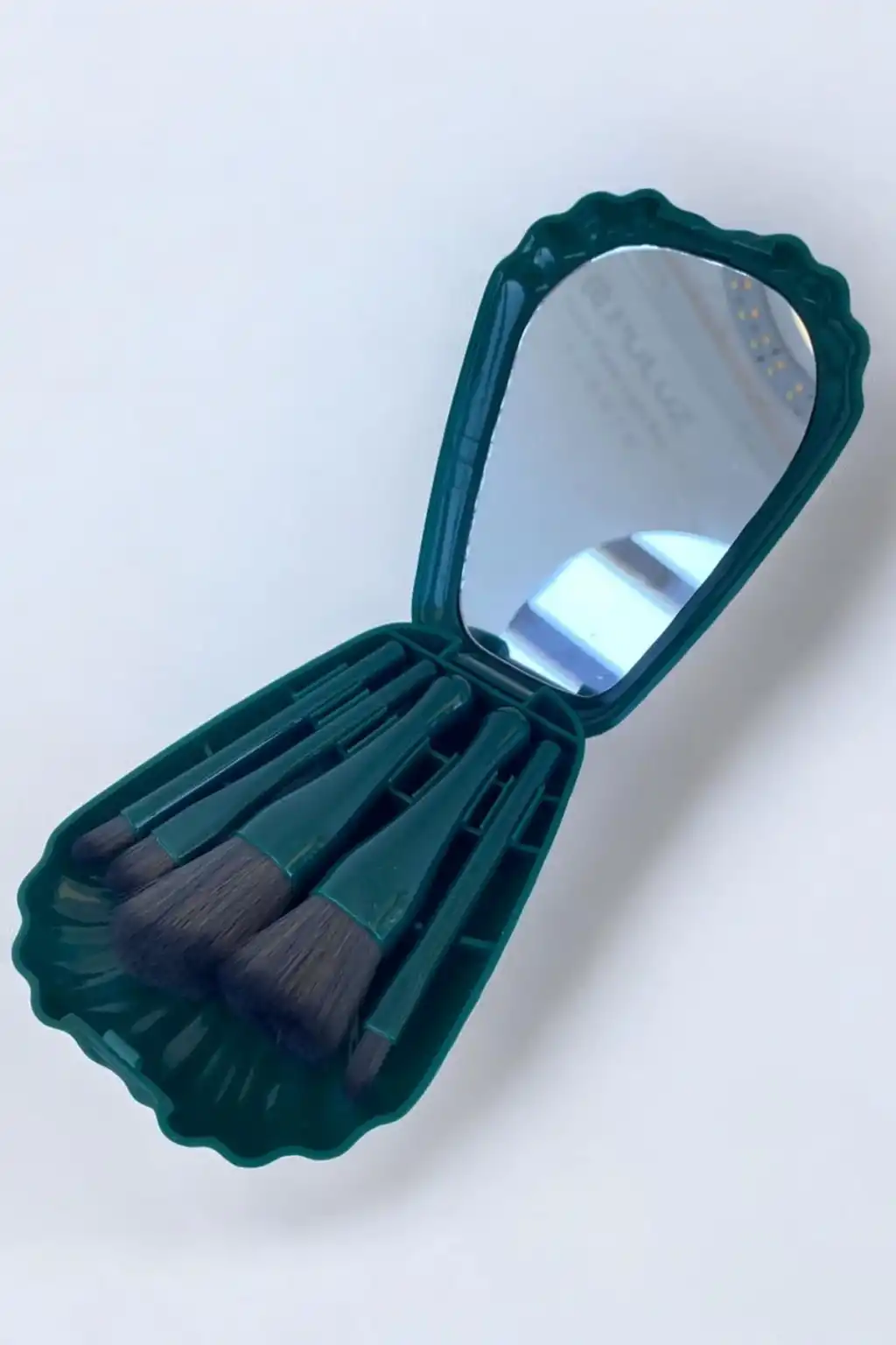 Yeşil Renk Deniz Kabuğu Figürlü Makyaj Fırçası/ Ayna Set