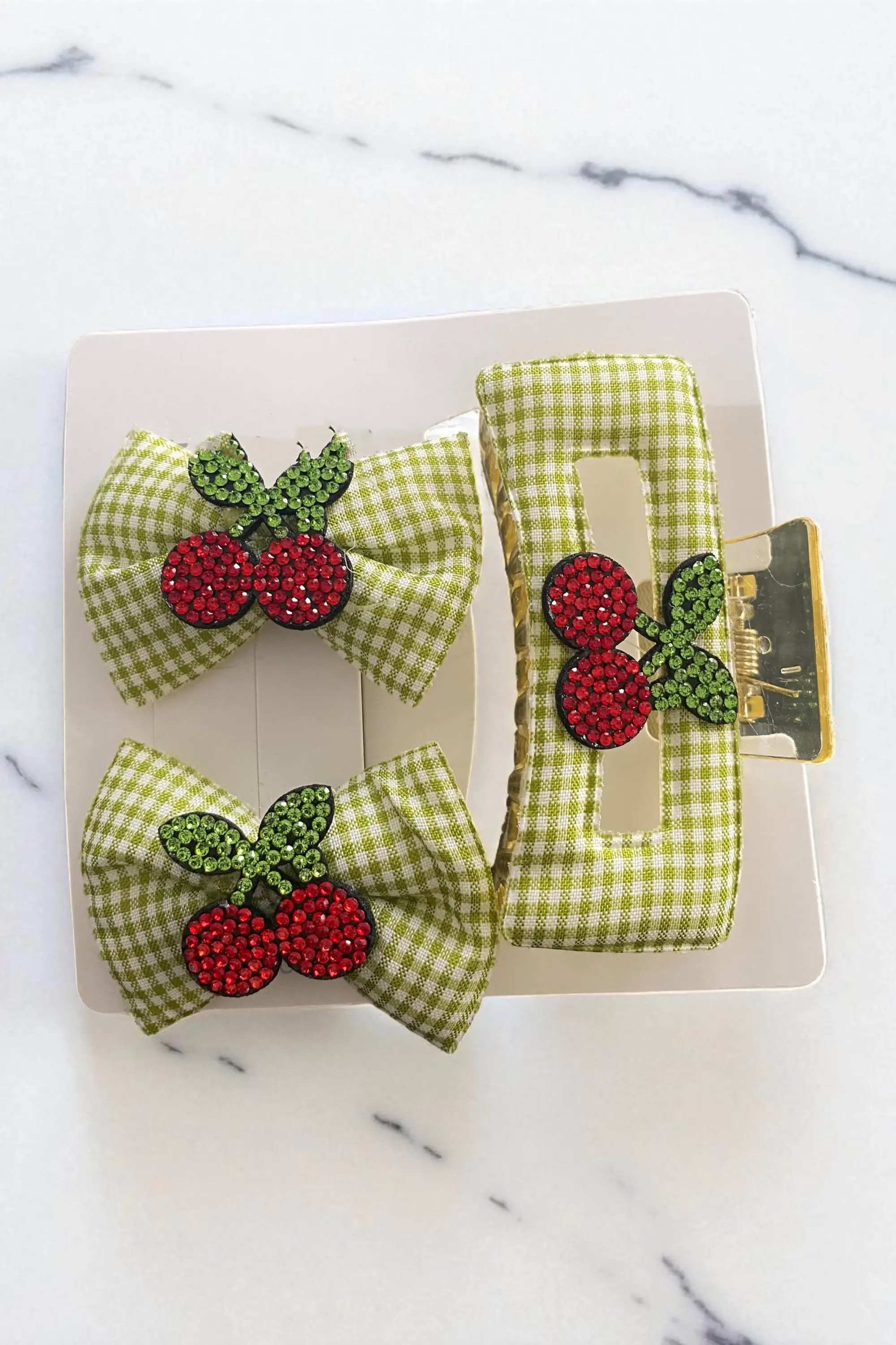 Yeşil Renk Kiraz Figürlü Potikare Desenli Yan Toka Ve Mandal Toka Set